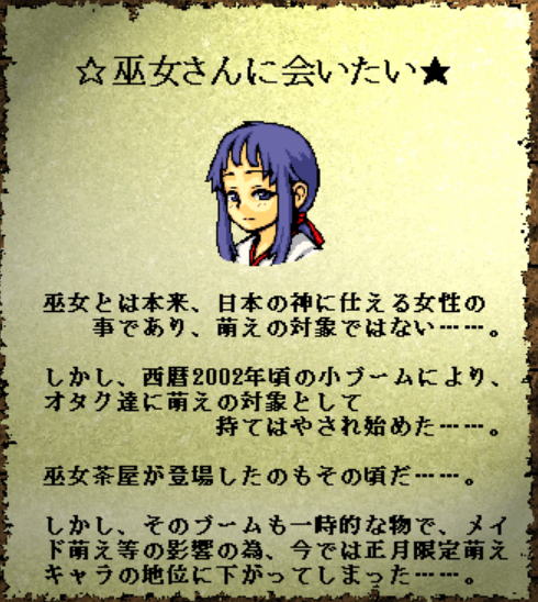 巫女茶屋(名古屋に実際にあった様で、詳しい事は不明w西暦2004年頃潰れて今は無いのは確かw)が登場したのもその頃だ……。